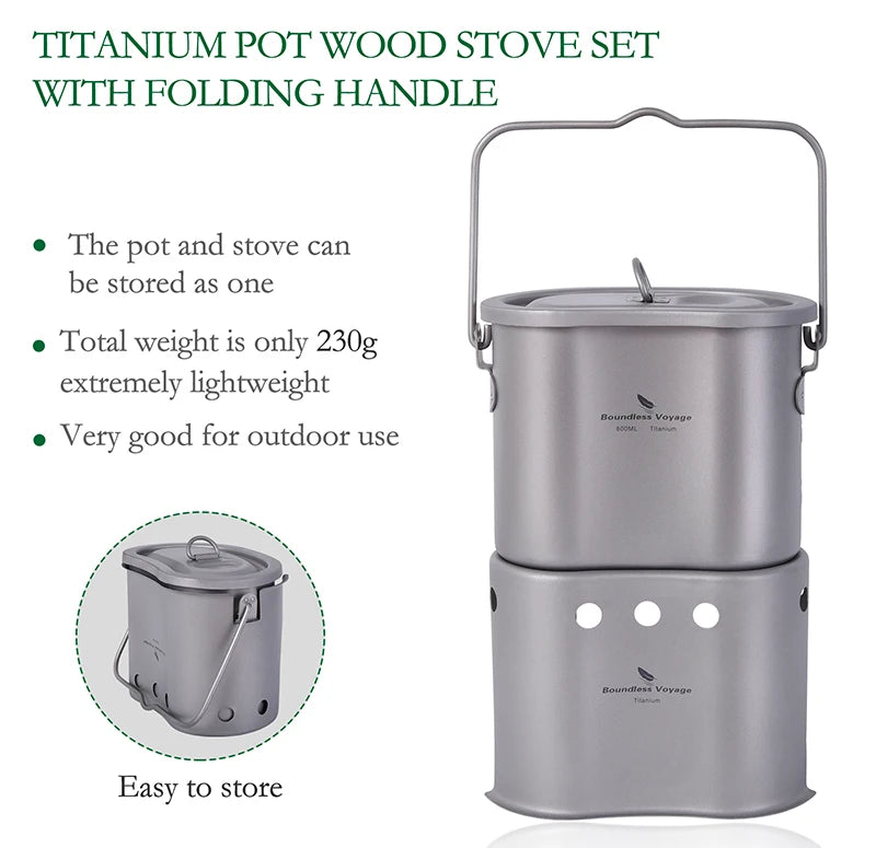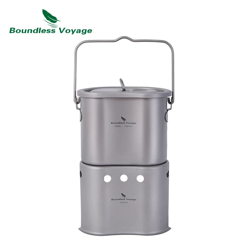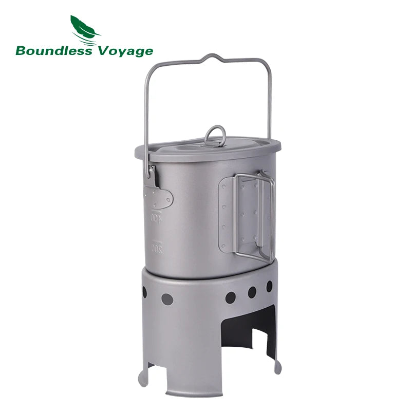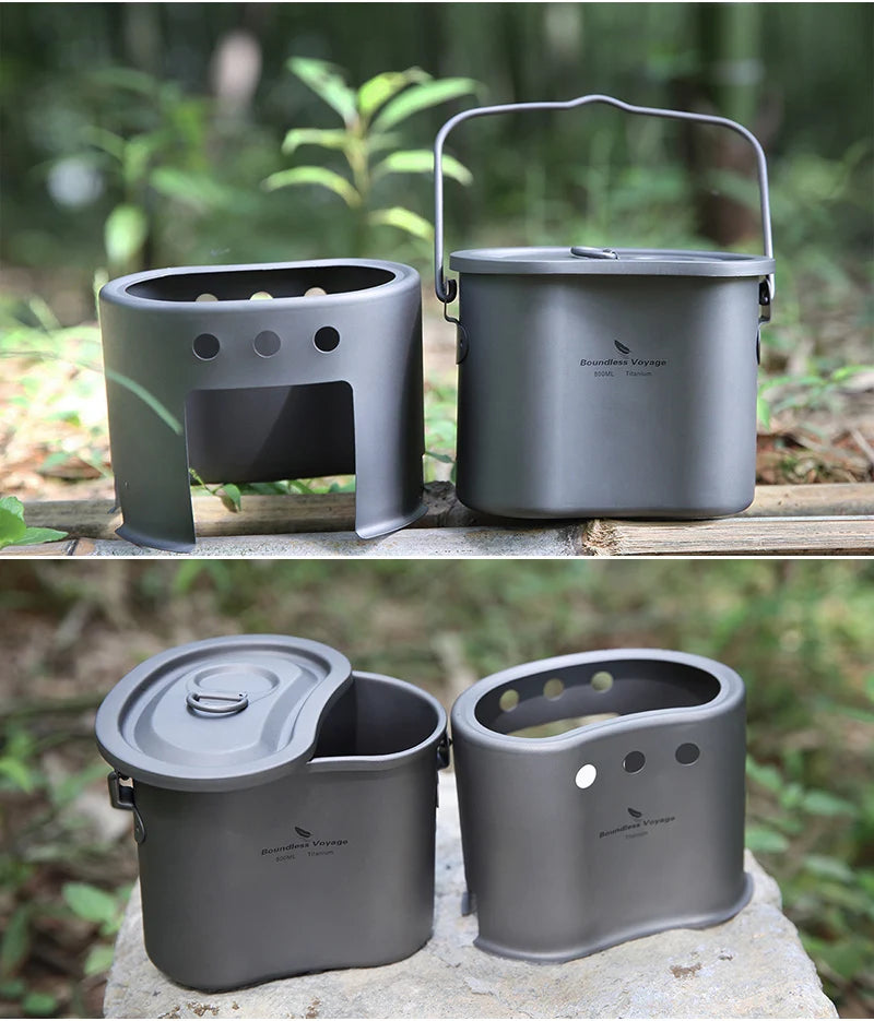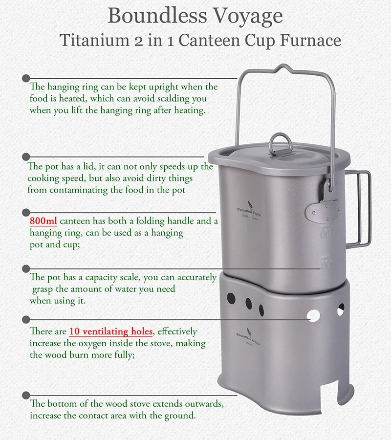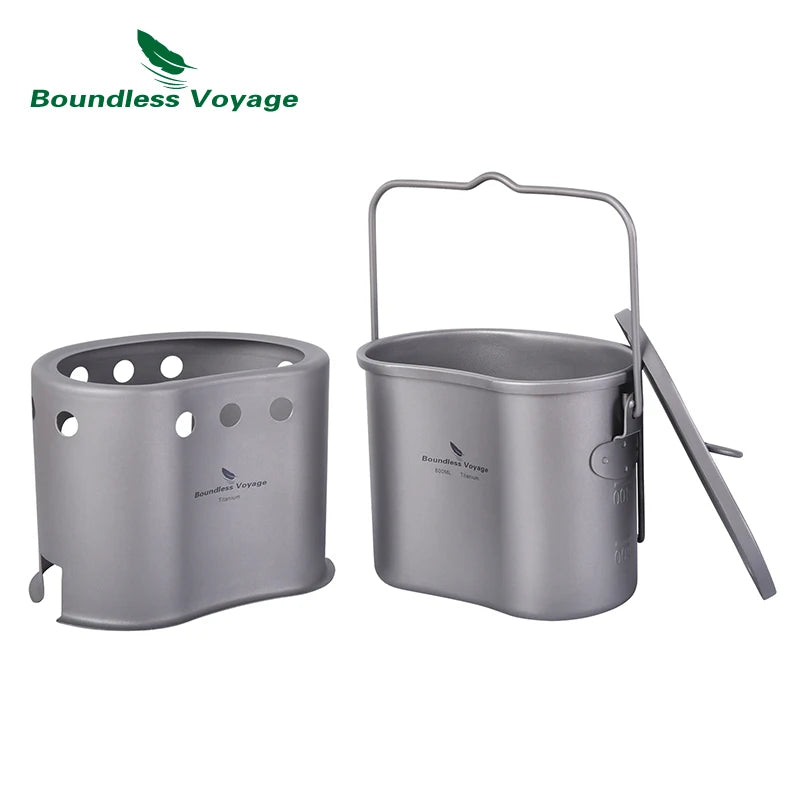 Boundless Voyage 2 in 1 Camping Titanium Pot Wood Stove Set 800ml Canteen Cup Outdoor Solo Cookware Mess Kit for 1 Man