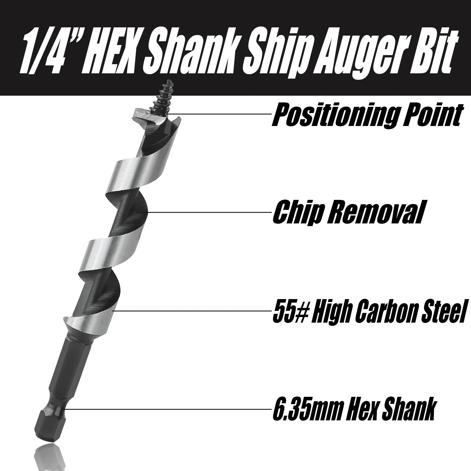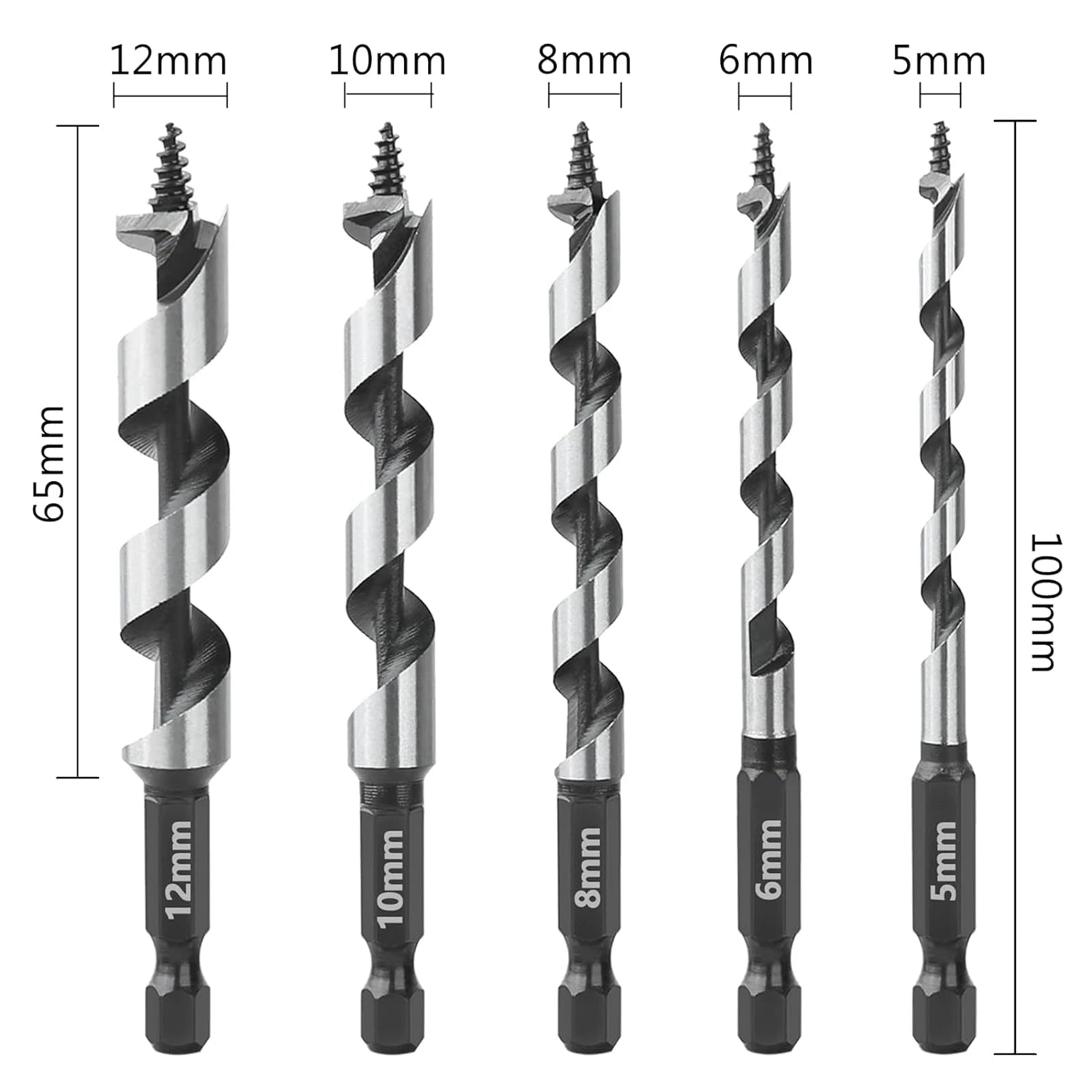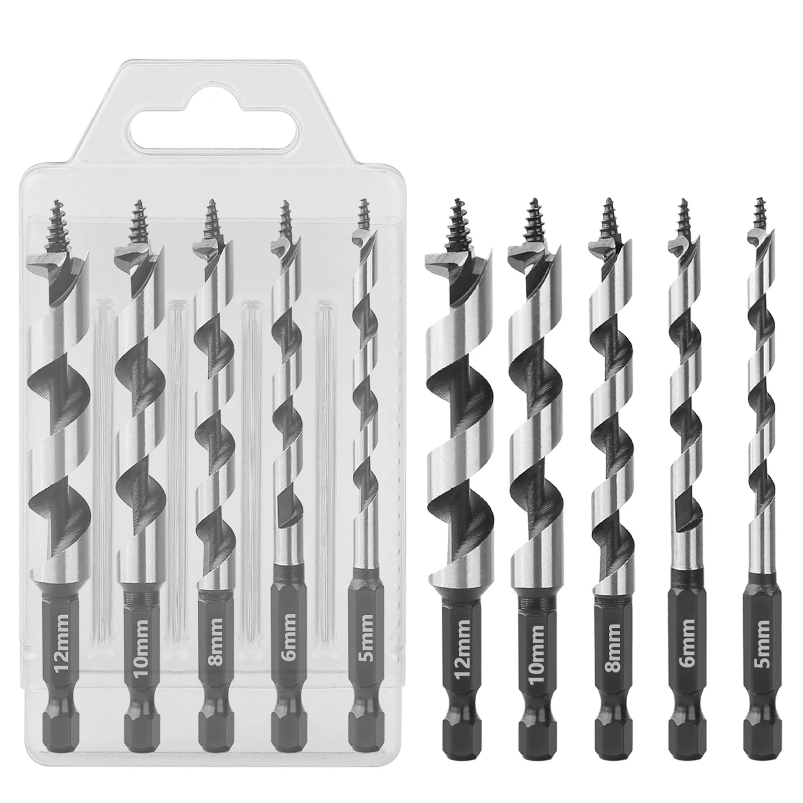 HEDA 5Pcs 5/6/8/10/12mm Woodworking Ship Auger Drill Bit Set 1/4'' Hex Quick Change Shank HCS For Soft Hard Wood Hole Saw