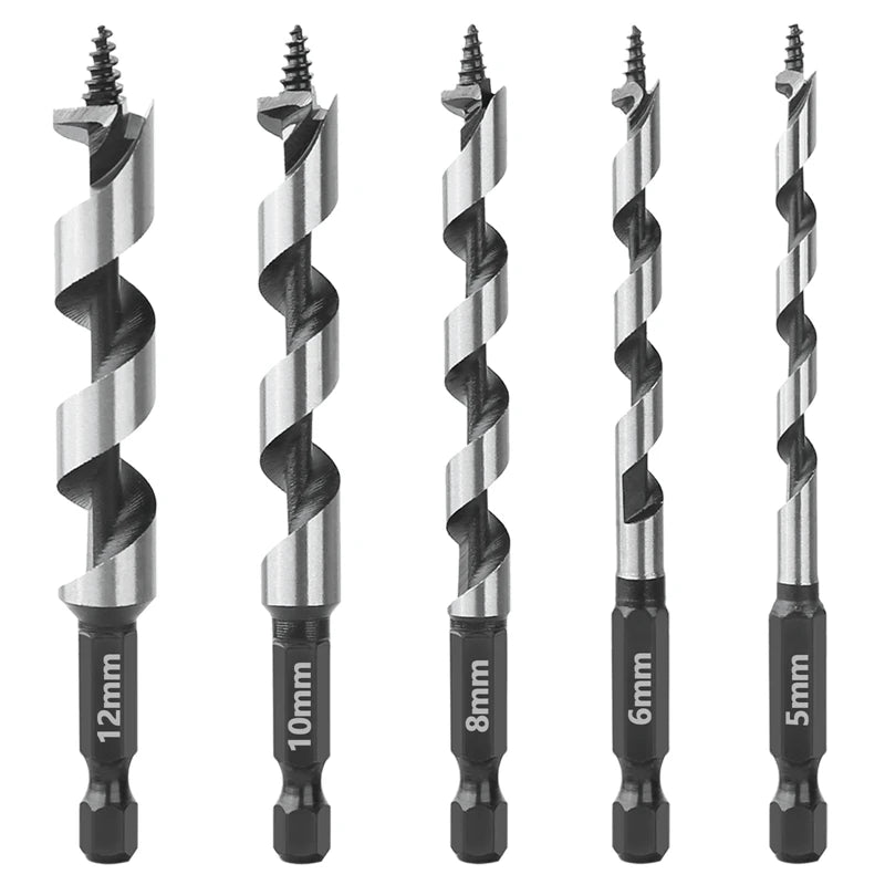 TitanBore⢠5-Piece Ship Auger Drill Bit Set ā 1/4" Hex Quick Change HCS Woodworking Power Pack (5/6/8/10/12mm)
