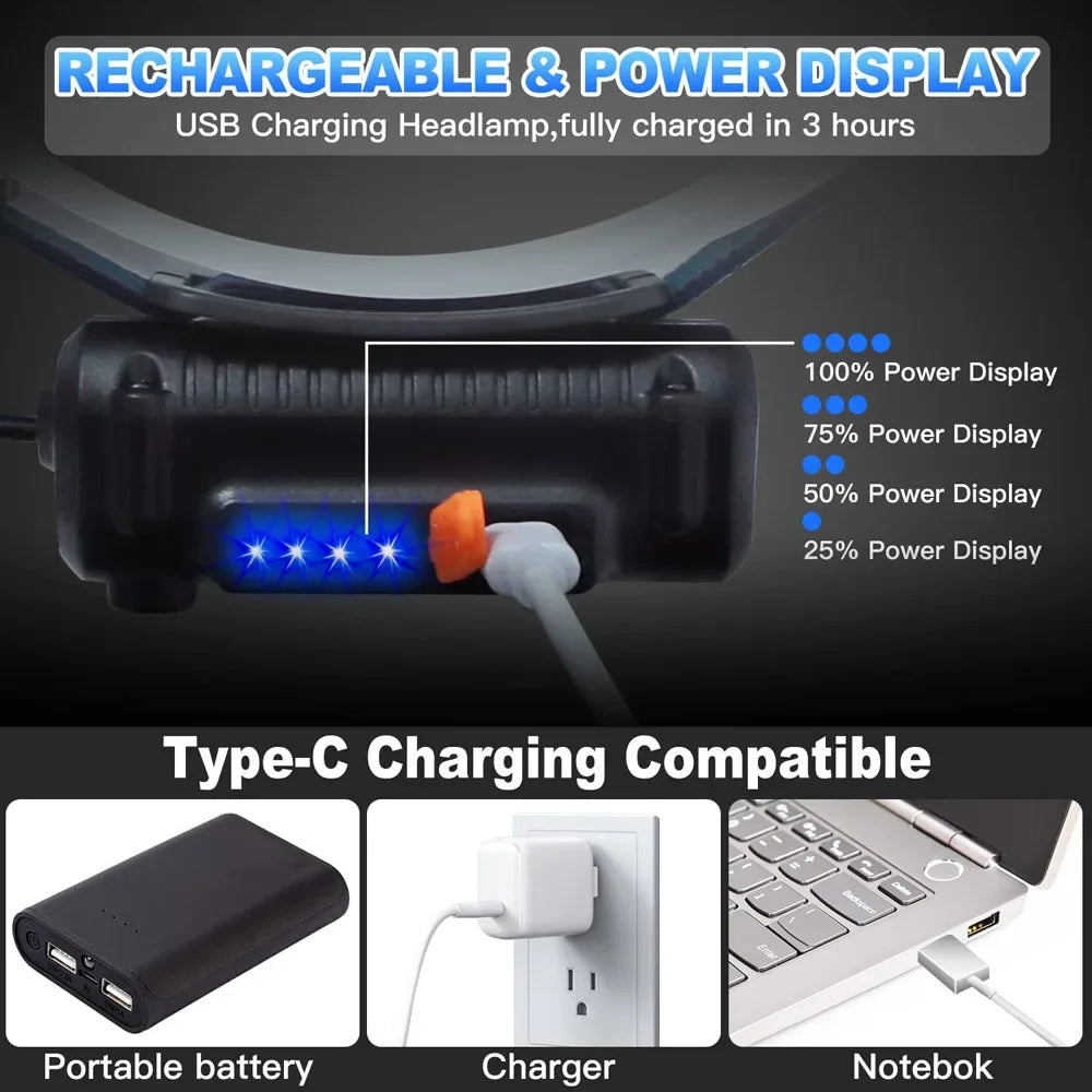 • USB Rechargeable :No need to worry about replacing batteries, simply recharge the headlamp with a USB cable.