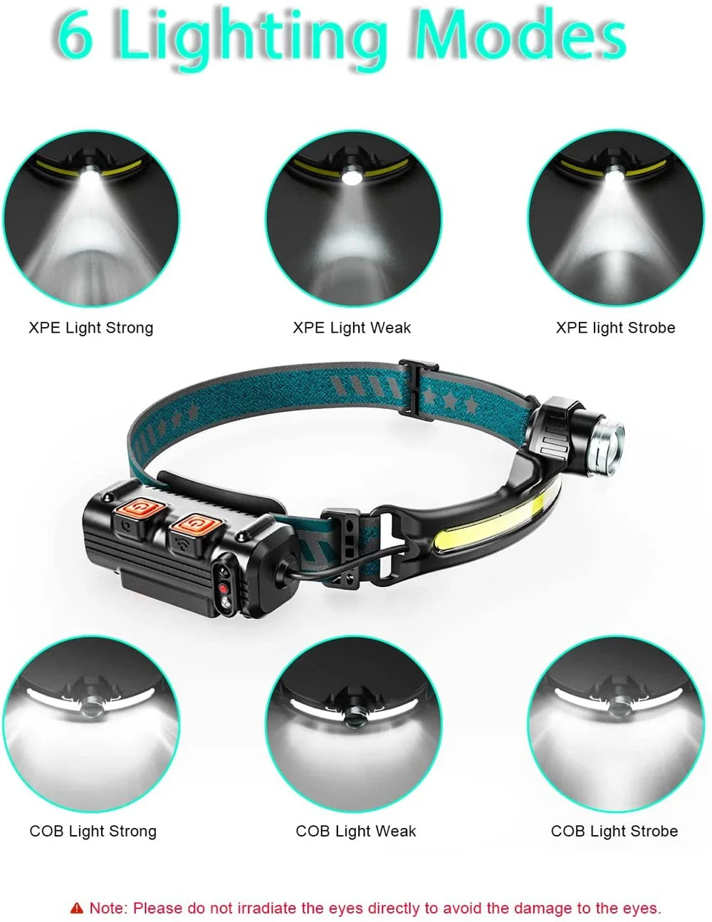Induction Headlamp XPG+COB LED Head Lamp with Built-in Battery Flashlight Multi-function USB Rechargeable 6 Modes Head Torch