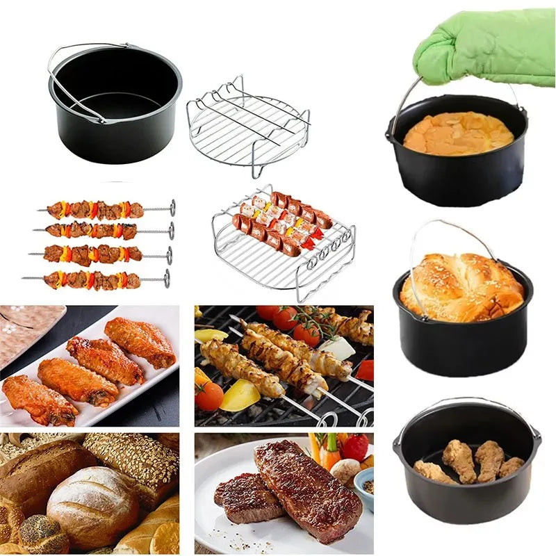 The AirBake⢠NonāStick Air Fryer Accessories set is designed to enhance your cooking versatility, allowing you to bake, roast, and grill with ease. This comprehensive set includes a universal baking pan, cake barrel, pizza tray, and grill rack, all crafted to fit most air fryer models. Whether you're preparing a quick snack or a full meal, these accessories ensure even cooking and easy cleanup.