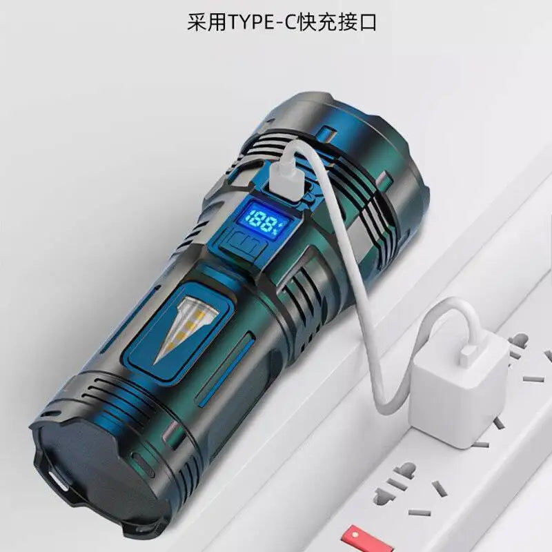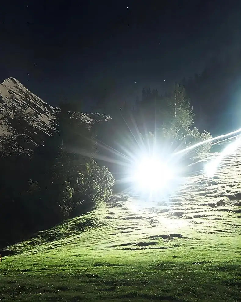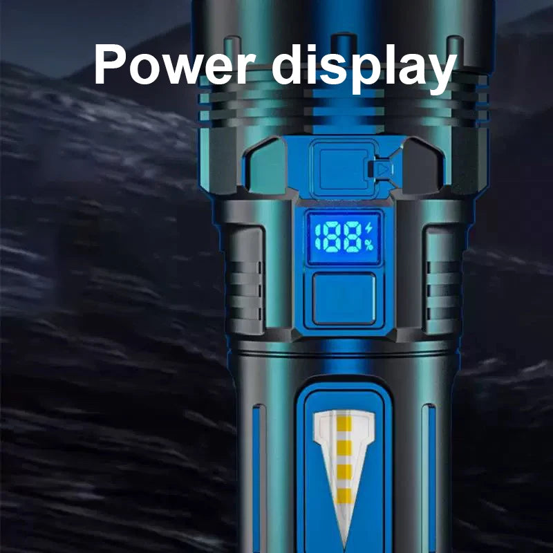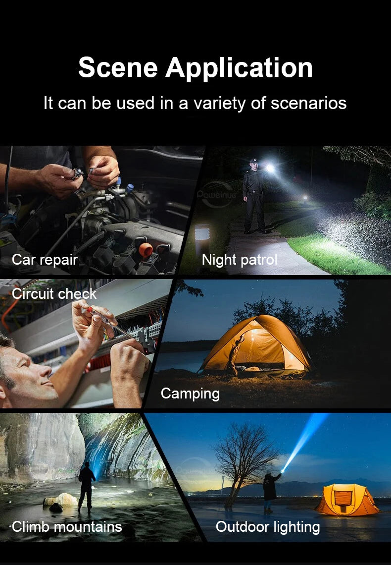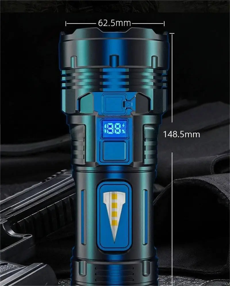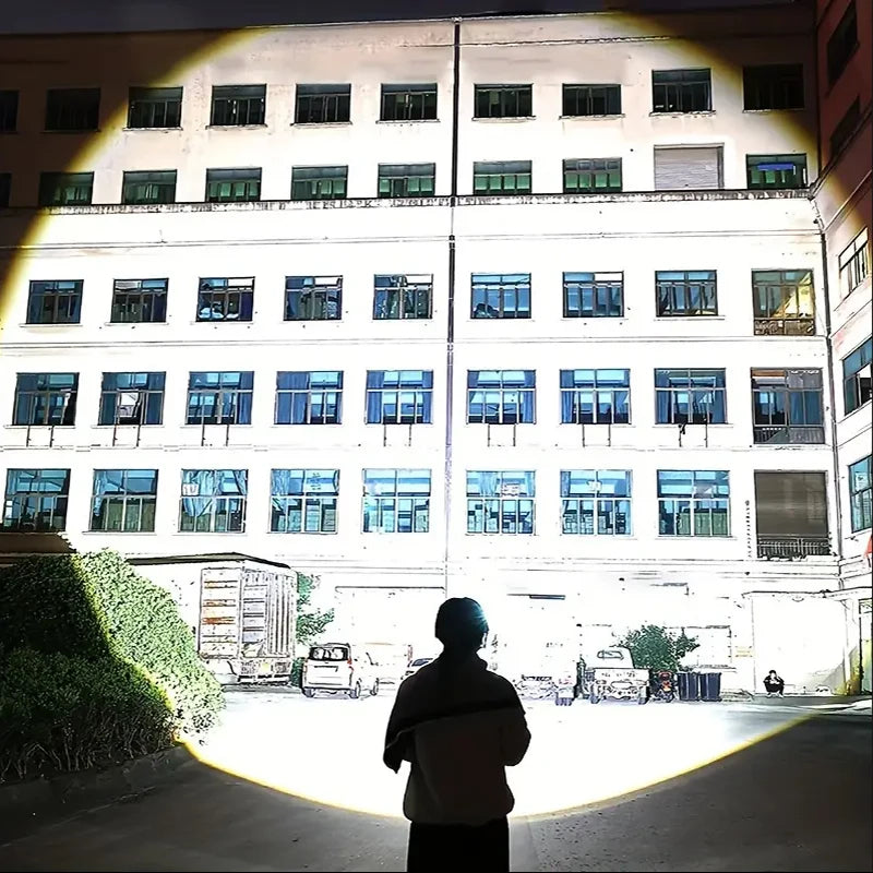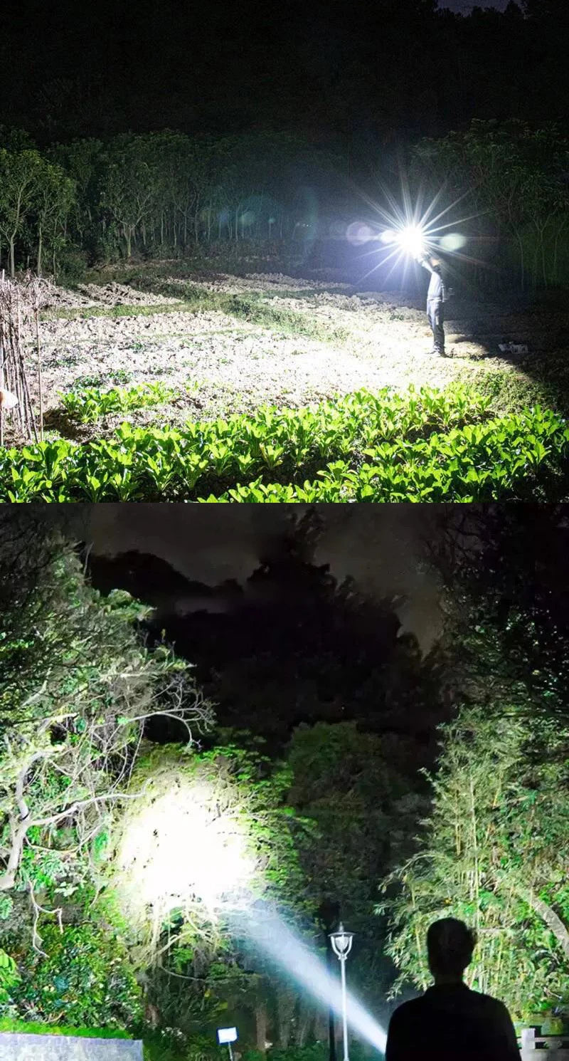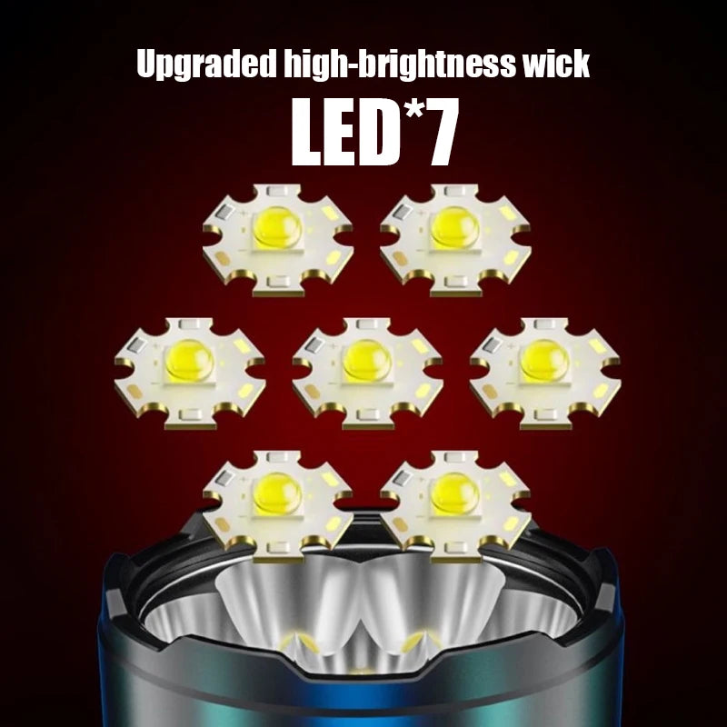 The flashlight has 7 lamp beads. This design greatly improves the brightness and lighting distance of the main light. The wide lighting range can reach up to 500 square meters, illuminating larger areas, close lighting or situations requiring wide viewing angles. It is suitable for outdoor adventures, search and rescue operations and other scenes that require long-distance lighting.