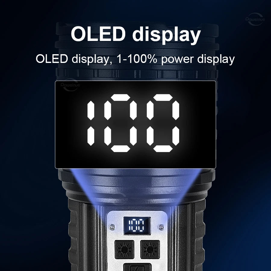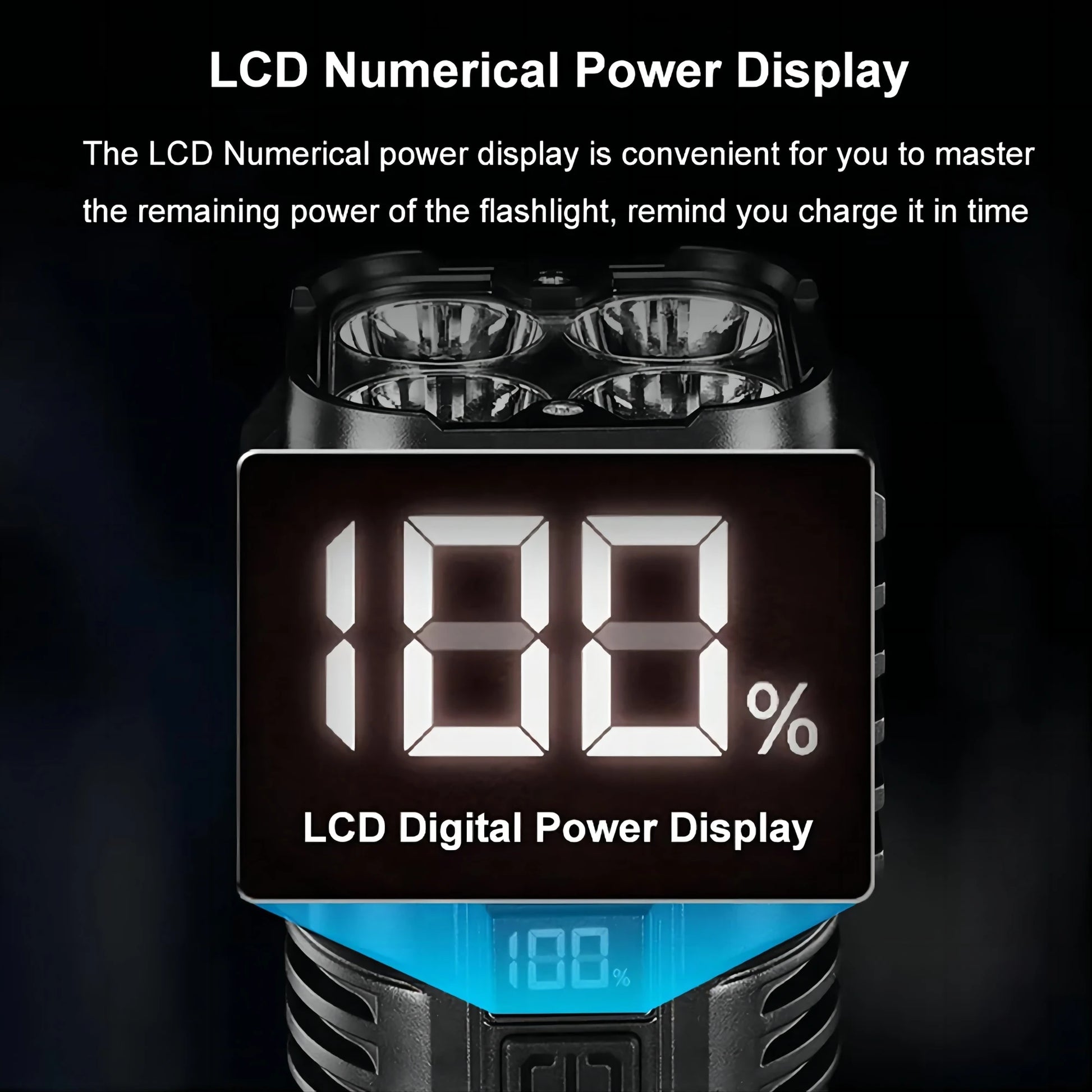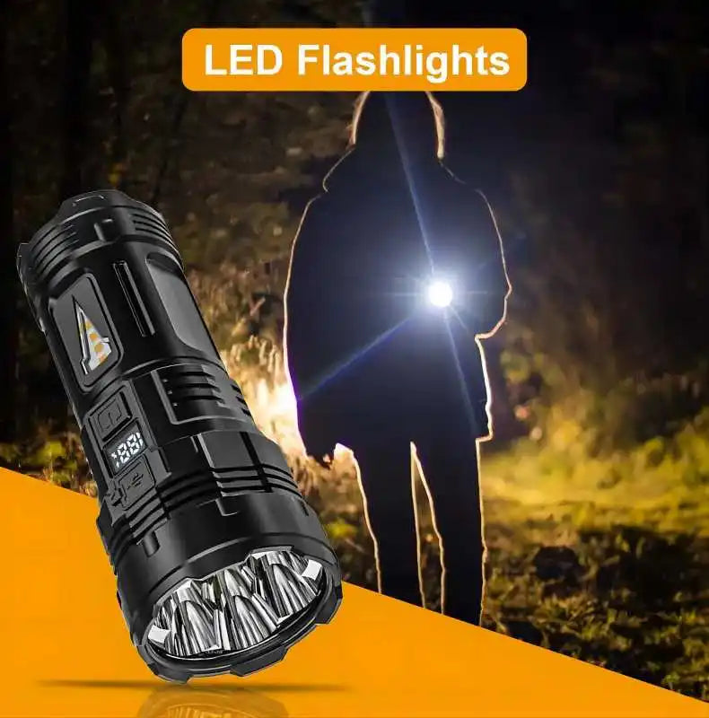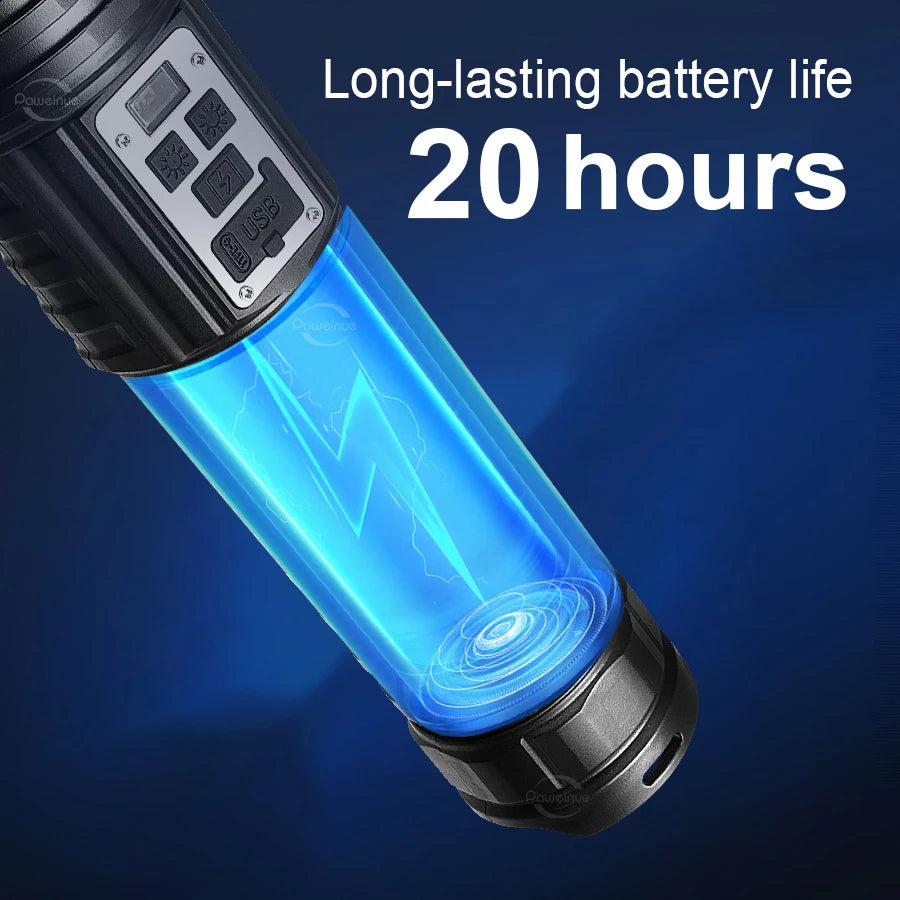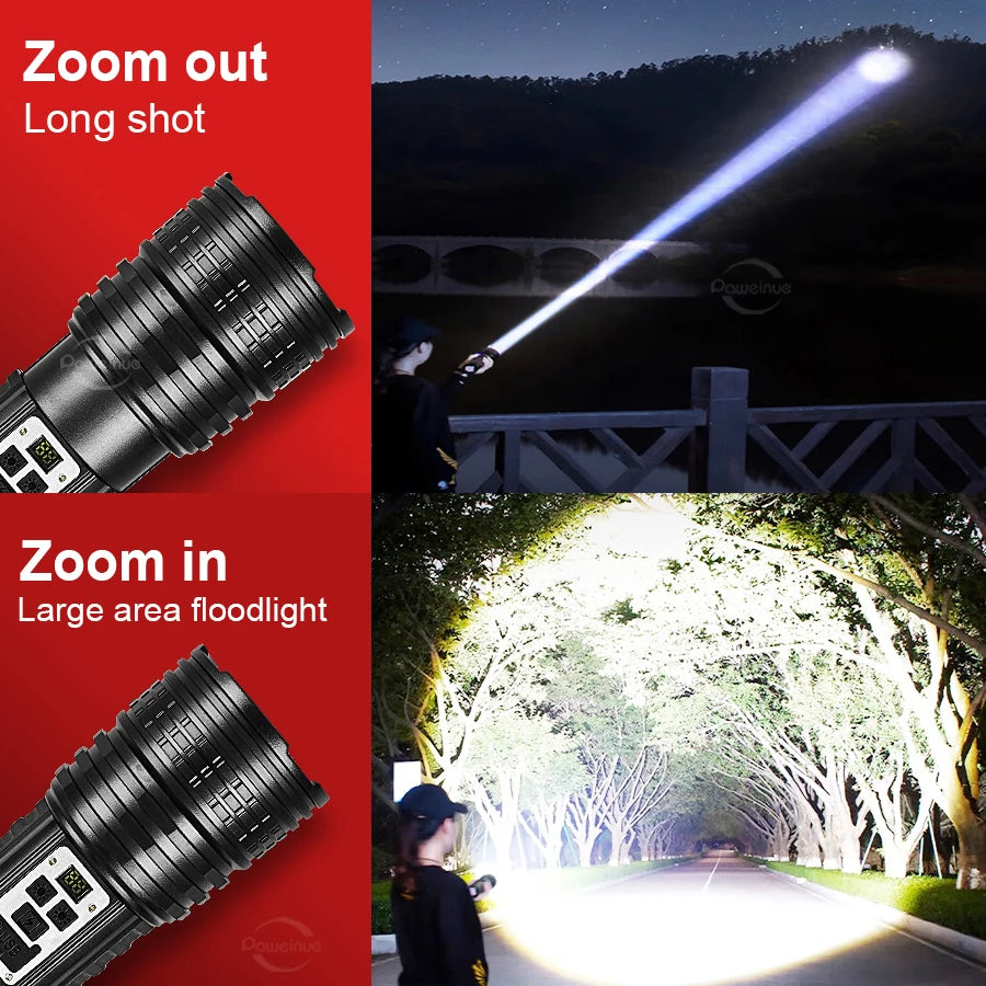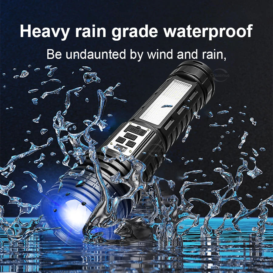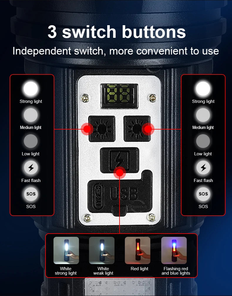 The flashlight has 7 lamp beads. This design greatly improves the brightness and lighting distance of the main light. The wide lighting range can reach up to 500 square meters, illuminating larger areas, close lighting or situations requiring wide viewing angles. It is suitable for outdoor adventures, search and rescue operations and other scenes that require long-distance lighting.
