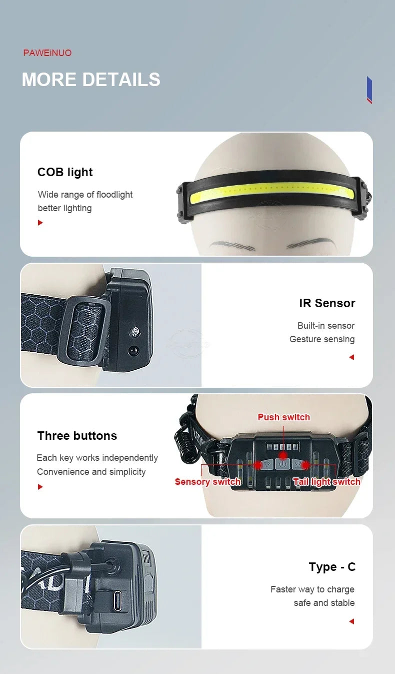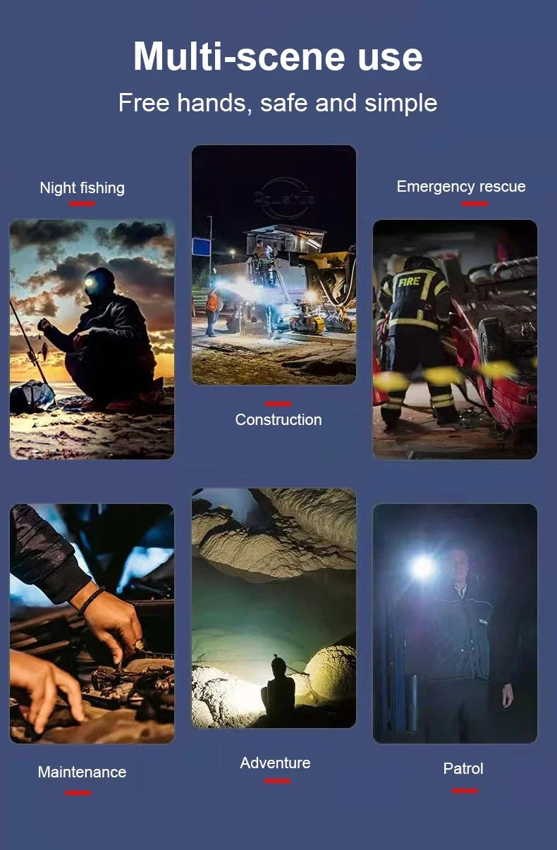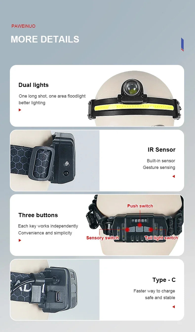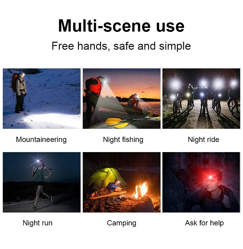 This headlight is the latest compact and lightweight XPG+COB combination headlight with spotlights and floodlights, to provide a 270° area of illumination, Built-in high-capacity battery, lasts 3 hours. It also has telescopic focusing and sensing functions, freeing hands. Perfect for work, camping, running, hiking and other activities.