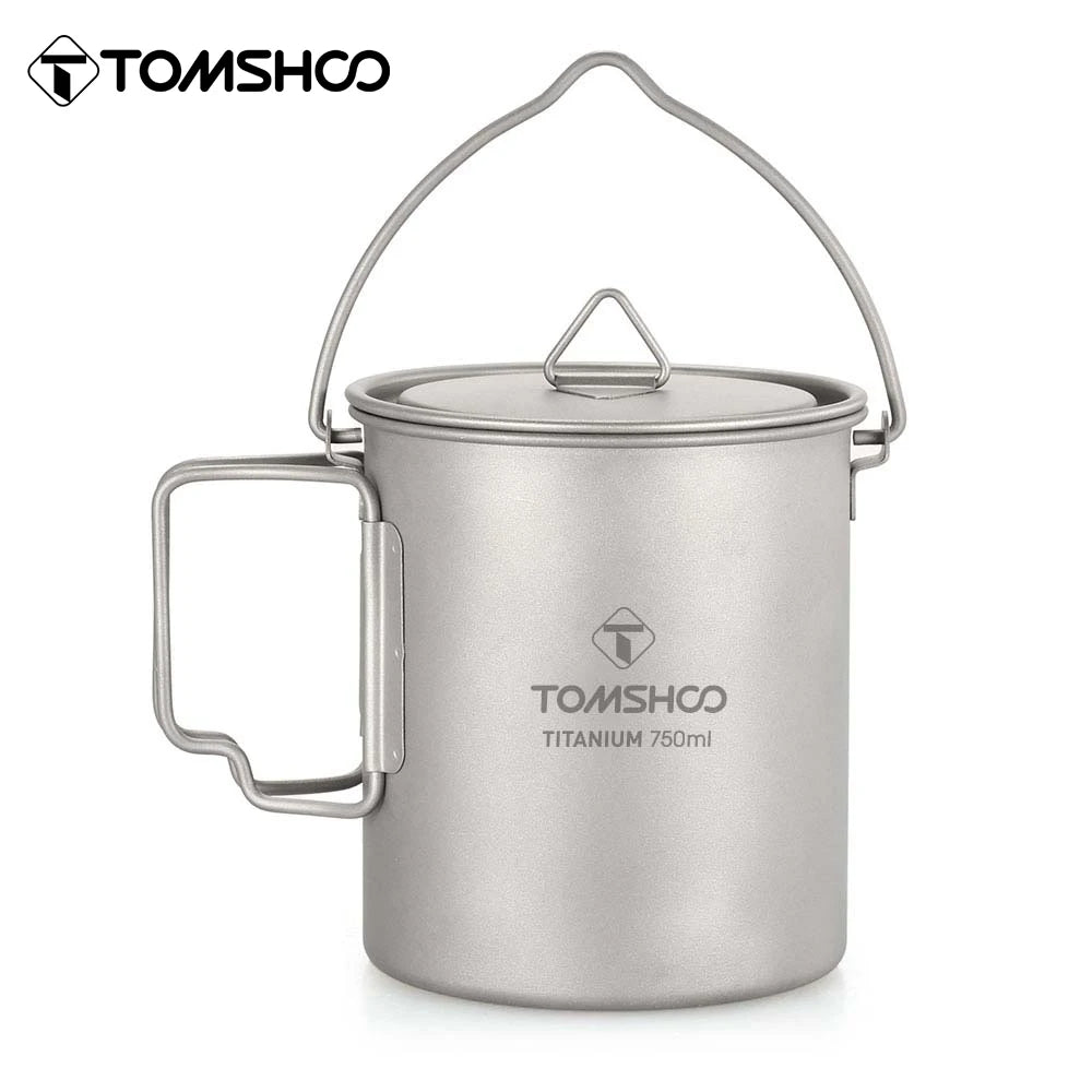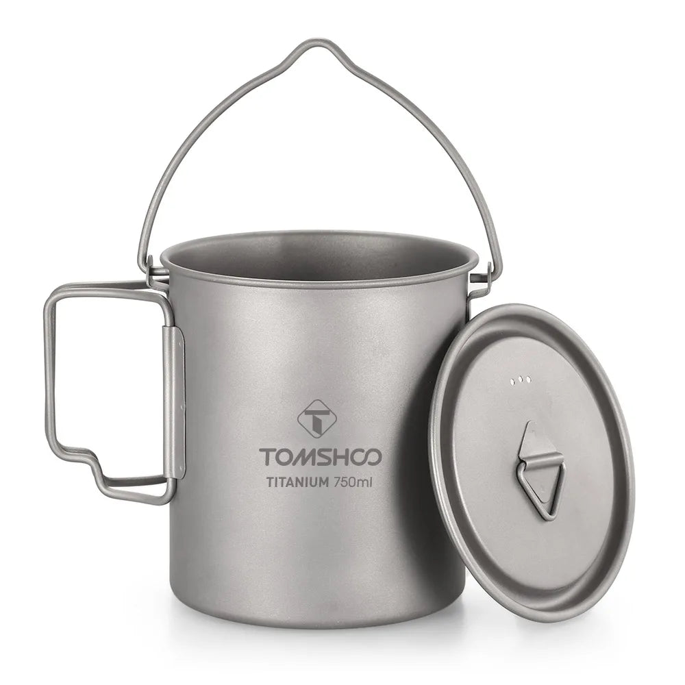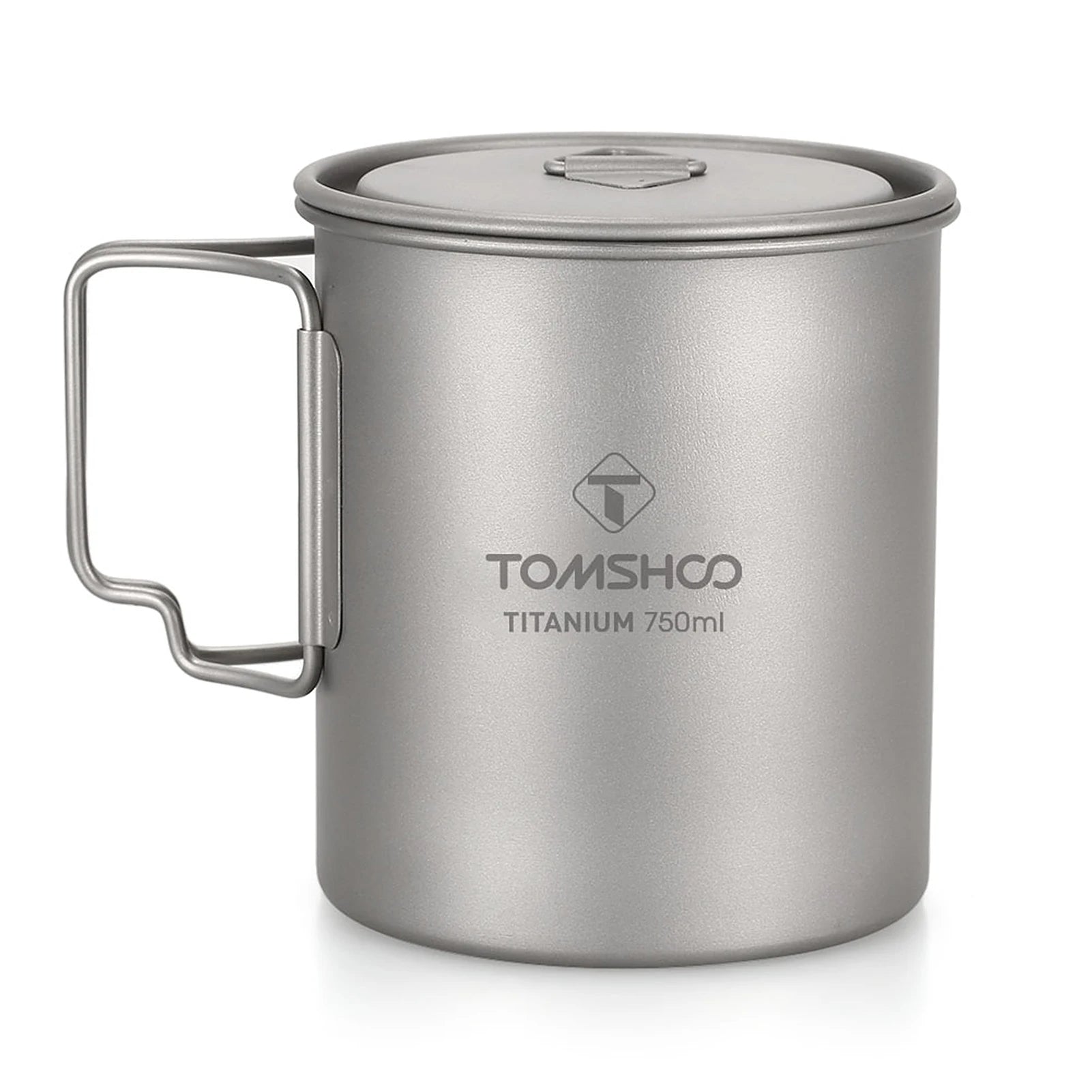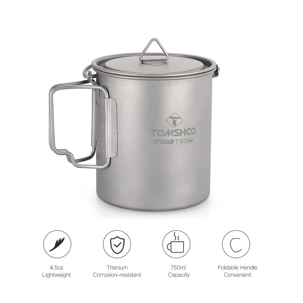Tomshoo Ultralight 750ml Titanium Pot Portable Titanium Water Mug Cup w/ Lid Foldable Handle Outdoor Camping Picnic Supplies